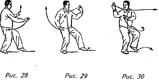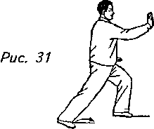 Движение 2: Поверните верхнюю часть тела влево, сделайте левой ногой шаг вперед и влево и перенесите на нее центр тяжести, переходя на левый “шаг вдоль кромки радуги”. Одновременно с этим передвиньте правую руку обратно и вытолкните вперед от правого уха, удерживая кисть на уровне носа, ладонь обращена наружу. Дайте левой руке опуститься до левого колена, круговым движением “почистите” его, доводя ладонь до левого бедра. Взгляд теперь направлен в сторону пальцев правой руки (рис. 31).