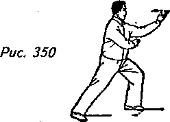 Движение (продолжает рис. 349): Поднимите к груди левую ладонь и вытяните ее вперед, пересекая траекторию, по которой возвращается назад правая ладонь. Одновременно с этим сделайте небольшой шаг вперед левой ногой и перенесите на нее вес своего тела, переходя на левый “шаг вдоль кромки радуги”. Взгляд при этом должен быть направлен на левую ладонь (рис. 350).