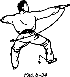 Продолжая предыдущее движение правая стопа поворачивается на носке, левая стопа поворачивается на пятке, корпус поворачивается вправо образуя мабу, одновременно левая ладонь возвращается к левой стороне груди, правая ладонь от груди через переднюю зону идет вправо и обращенная центром вниз правая ладонь с внешним ребром ладони в качестве точки приложения силы за счет распрямления руки наносит горизонтальный срубающий удар вправо, рука находится на уровне плеча или чуть выше. Смотреть вправо (рис. 6-34).