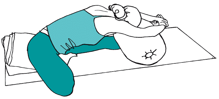 Рис. 23В. ПОЗА ГОЛОВЫ К КОЛЕНЯМ. ЭТАП 2А ИЛИ 2Б – С БОЛСТЕРОМ И ОДЕЯЛАМИ (c. 76)