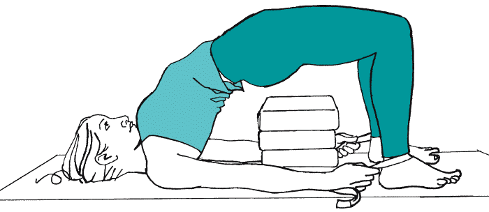 Вариация с опорой для таза и ремнем. Одно из преимуществ этой позы для беременных и кормящих женщин заключается в том, что она помогает сохранить здоровой грудь до и во время лактации. Чтобы избежать чрезмерного напряжения, подкладывайте под таз опору (рисунок 21А). Итак, лягте на пол и согните ноги в коленях, поставив стопы на ширине бедер и параллельно друг другу. Приподнимите таз и подложите под него опору (4 толстые книги), медленно опустите на нее ягодицы. Набросьте на лодыжки ремень и захватите его руками. Оторвите таз и бедра от опоры и поднимите грудную клетку. Крепко ухватитесь за ремень, прижмите стопы к полу и, используя усилие этого рычага, еще сильнее втяните верхнюю часть позвоночника и подайте копчик к потолку. Использование ремня позволяет усилить прогиб спины и расширение грудной клетки. Во время третьего триместра беременности оставайтесь в позе столько, сколько вам комфорт но. Чтобы выйти, опустите ягодицы на опору и полежите так несколько секунд. Затем уберите опору и мягко опустите таз на пол. Повернитесь на левый бок.