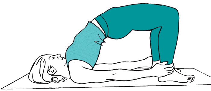 Направьте края лопаток внутрь спины и к потолку – это позволит поддерживать положение верхней части спины и позвоночника и соединение с копчиком и стопами. Еще раз оттолкнитесь стопами от пола и поднимите еще выше таз и корпус. Втягивайте лопатки до тех пор, пока не почувствуете, что грудина приняла вертикальное положение, а грудная клетка расширилась. Все эти действия очень полезны для ткани молочных желез.