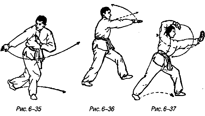 Продолжая предыдущее движение правая нога чуть поднимается, носок разворачивается наружу, тут же обращающаяся центром вниз правая ладонь с районом между большим и указательным пальцами в качестве точки приложения силы нажимает вправо-назад, правая нога используя силу всего тела сгибаясь в колене всей стопой топает по земле, смотреть вправо-вниз(рис. 6-35).