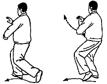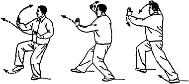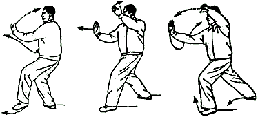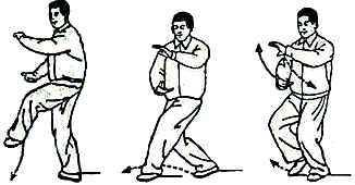 Обратить внимание: при выносе рук вперед не наклоняться и плечи не поднимать. Движения рук координируются с движениями талии и ног. В позиции “лук-стрела” внутреннее расстояние между линиями пяток составляет примерно 30 см. В конечном положении направление на 2 часа.
