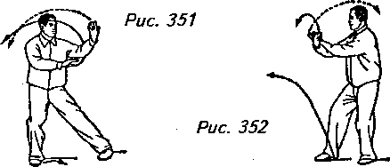 Движение 1 (прод. рис. 350): Перенесите вес тела на правую ногу и поверните левый носок вовнутрь. Затем верните центр тяжести на левую ногу, повернув весь корпус на 180° вправо, и немного поднимите правую пятку, делая правую ногу “опустошенной”. Одновременно с поворотом корпуса обе руки нужно переместить до пересечения перед грудью, ладонями внутрь, причем правая ладонь снаружи (рис. 351, 352).