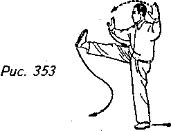 Движение 2: Разведите обе руки горизонтально в разные стороны ладонями от себя. Одновременно с этим поднимите правую ногу и мягко выбросьте вперед пятку. Взгляд должен быть направлен прямо вперед (рис. 353).