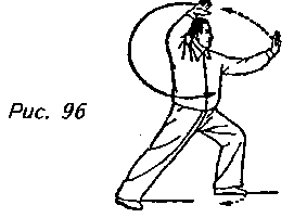Движение (продолжает рис. 95): Поверните немного верхнюю часть корпуса вправо, сделайте маленький шажок левой ногой вперед и перенесите центр тяжести на нее, переходя на левый “шаг вдоль кромки радуги”. Выполняя эту часть упражнения, поднимите по кривой перед грудью правую руку, чтобы она оказалась над головой поверхностью ладони под углом от себя, образуя при этом с левой рукой полуокружность. Правую руку вытолкните по горизонтали от груди, направляя поверхность ладони вперед и сохраняя ее на уровне переносицы. Взгляд должен быть обращен к левой ладони (рис. 96).