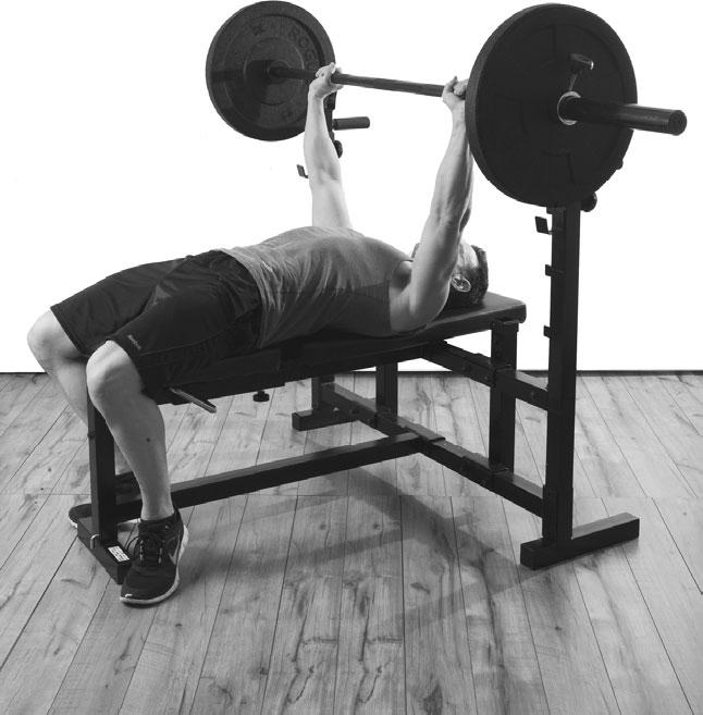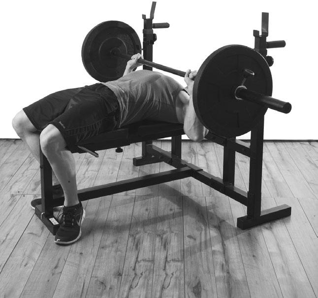 Сведите лопатки и расправьте грудь. При этом вы прогнетесь и поясница оторвется от скамьи. Вы будете касаться скамьи ягодицами, лопатками и затылком. Положение ног и всего тела должно быть устойчиво. Именно поэтому так важно отрабатывать это положение без отягощения! Расположитесь на скамье так, чтобы оставалось достаточно места для того, чтобы выжать штангу над грудью, не задевая стойку, когда будете поднимать отягощение. Не следует располагаться слишком далеко от стойки. Положение рук должно быть достаточно устойчивым, чтобы вы могли снять штангу. Поскольку скамьи для жима лежа имеют разные конструкции, прежде освойтесь в принятом положении и разомнитесь с «незаряженным» грифом.