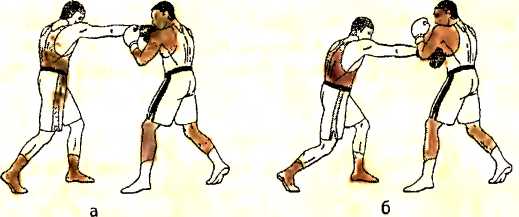б ) отталкиваемся правой ногой и наносим ответный прямой удар правой рукой в туловище противника;