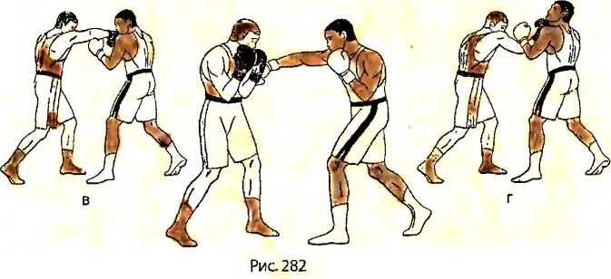 В ответ на боковой удар правой рукой в туловище со стороны противника, отталкиваемся левой ногой и делаем шаг правой ногой назад, с последующим подтягиванием левой ноги к правой ноге (рис. 281 - вид справа).