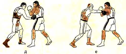 д ) отталкиваемся правой ногой и наносим ответный удар снизу правой рукой в туловище противника;