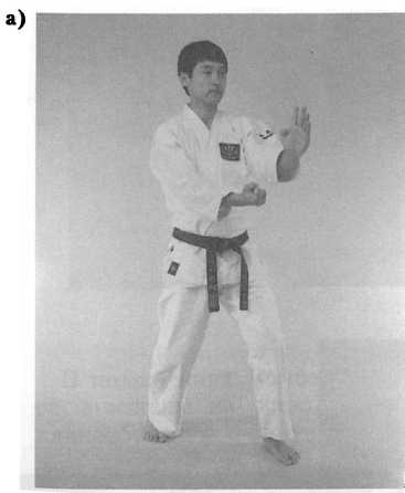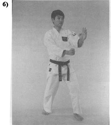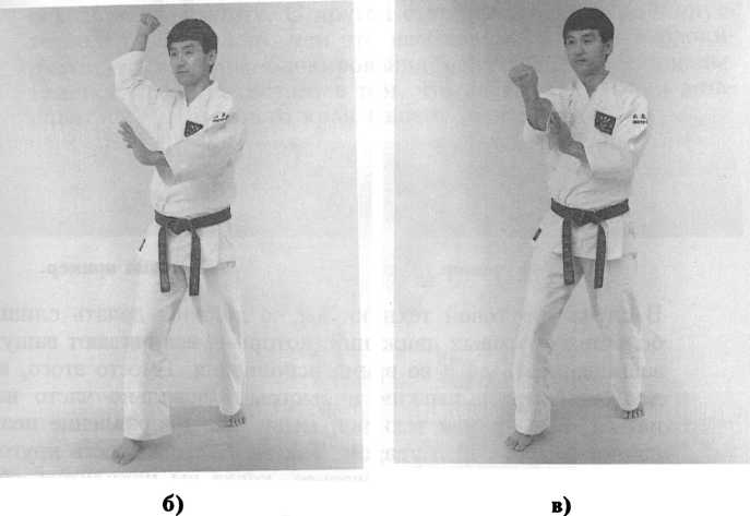 В положении блока ЁКО-УЧИ (позиция а) вы скользите вперед и бьете УРА-УЧИ (позиция в). Не “заводитесь” для приготовления удара, как показано в позиции б).