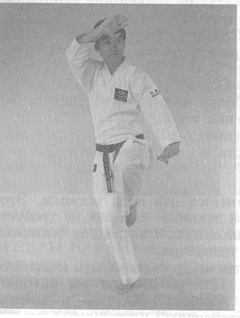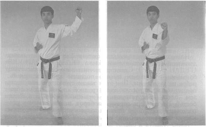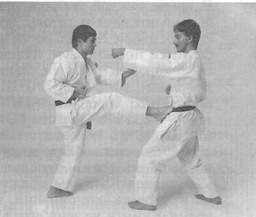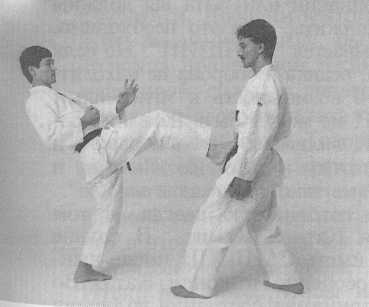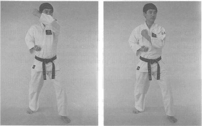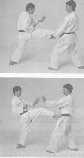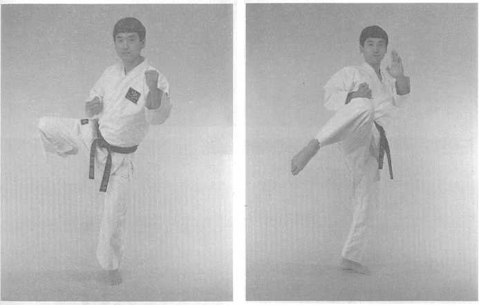 На этих фотографиях показаны дополнительные движения начального момента техники, называемой “МАВАШИ-КЕРИ” (круговой удар ногой). Слева: колено ударной ноги поднято в сторону и все жизненно важные части тела не защищены. Справа: колено направлено прямо на соперника с одновременным изгибом таза и поворотом верхней части тела для размещения ноги сбоку, готовой к применению круговой техники.