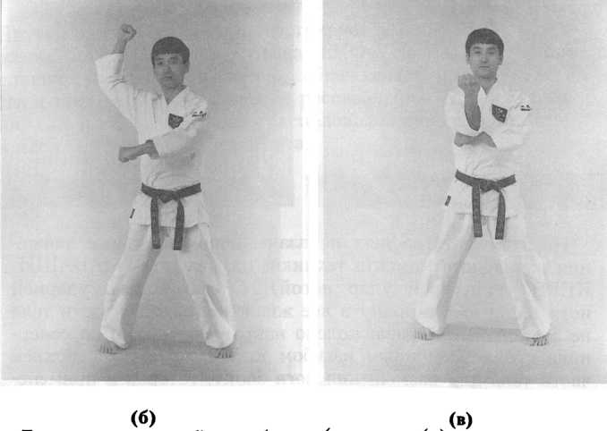 В положении двойного блока (позиция (а) довольно многие “заводятся” (позиция (б) для удара Ура-учи (позиция (в). Но позицию (б) надо избегать по причинам, о которых я уже упоминал. Вместо этого, техника должна быть исполнена непосредственно из позиции (а).