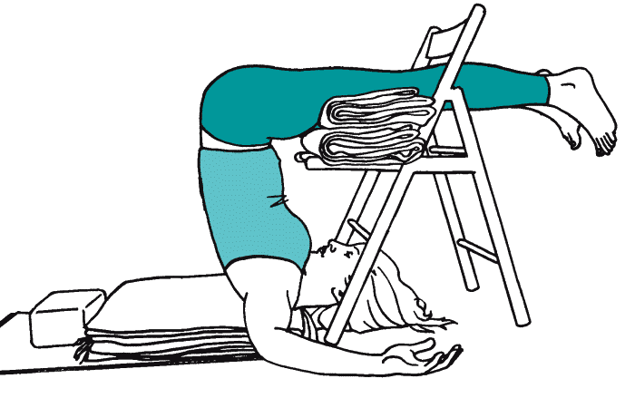 Чтобы избежать сдавливания живота, сделайте выше опору для ног: положите поперек табурета болстер (или 1–2 сложенных одеяла). Лягте спиной на одеяла, подтяните колени к груди и занесите ноги за голову. Опустите бедра на болстер или одеяла; стопы слегка разведите в стороны. Подвиньте стул ближе к себе так, чтобы его ножки касались стопки одеял, а бедра (но не колени) полностью лежали на опоре. Если вы испытываете сильное давление на шею, добавьте еще одно одеяло, отведите грудину от шеи или свесьте ноги на 3–5 сантиметров с табурета. Согните руки в локтях и положите их по обеим сторонам от ножек табурета. Сделайте глубокий вдох и полностью расслабьте все тело. Расслабьте мышцы вокруг глаз и рта; расслабьте мышцы спины. Руками мягко отведите макушку головы дальше от шеи и расслабьте заднюю стенку гортани. Дышите свободно и ровно. Отпустите все мысли и позвольте сознанию успокоиться.
