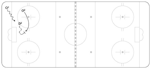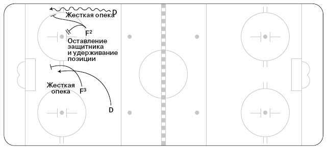 Во время опеки активно действующих защитников команды противника, если они выходят на голевую позицию, и F2, и F3 отвечают за опеку углов у синей линии со своей стороны. Все большее число команд побуждают своих защитников действовать активно. Если опекаемые защитники выходят на пятачок, опека становится жесткой. Если защитники скользят вдоль бортов, есть два варианта. Либо жесткая опека и перемещение вдоль борта в глубь зоны и в угол вместе с защитником, либо «игнорирование» защитника и удерживание позиции внутри площадки (рисунок 9.11). Как только оппонент оказывается в углу в глубине зоны, его опекают ваши защитники или находящийся в глубине зоны нападающий. F2 или F3 могут спуститься сюда и играть внутри площадки, но они не должны следовать за защитником, покидая так называемую голевую, а значит, опасную зону.