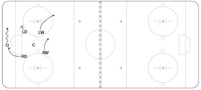 Во-первых, нужно определить, что позади ворот находится игрок, и перехватить пас. Если вы действуете в равных составах, сразу же начинайте прессинговать владеющего шайбой игрока. Во время прессинга постарайтесь оттеснить его с участка, где он получил пас и где он может получить поддержку. Если игрок чувствует себя неуверенно или у противника перевес, подождите с силовым давлением, пока все защищающиеся игроки не вернутся на свои позиции. RD вырывается вперед (если противник – правша), C остается в центре, не упуская из виду дальнюю стойку ворот, LD удерживает позицию сзади, а находящиеся поодаль нападающие подходят вплотную (рисунок 9.13). Как только защитник совершает рывок, LW (с той стороны, куда оттесняется противник) начинает откатываться назад в угол у синей линии со своего края, а RW жестко удерживает позицию на пятачке.