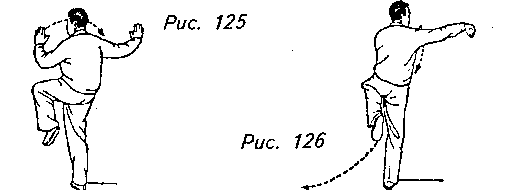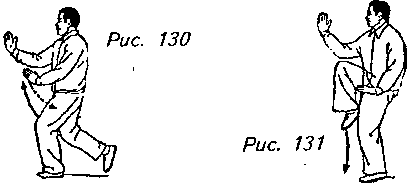 Движение 4: Медленно поднимите правую ногу с полностью согнутым коленом и носком, направленным вниз. Вы должны теперь стоять на одной левой ноге. Одновременно с этим ваша правая ладонь распрямляется и перемещается вперед и вверх, чтобы локоть оказался на одной линии по вертикали с правым коленом, а ладонь, направленная влево, на уровне плеча. Левая рука опускается до левого бедра, ладонью вниз. Взгляд теперь должен быть обращен к правой ладони (рис. 130, 131).