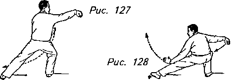 Движение 2: Медленно опускайтесь к земле, насколько вам позволит согнутое правое колено, и вытяните левую ногу влево как можно дальше. Одновременно с этим опустите левую руку к левому бедру и предоставьте ей скользить вдоль левой ноги с ладонью, направленной наружу. Взгляд должен быть обращен к левой ладони (рис. 127, 128).