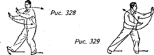Движение 1 (продолжает рис. 327): Отклоните верхнюю часть корпуса назад, перенесите вес своего тела на левую ногу и поверните кончики ее пальцев направо внутрь. Сделав это, поверните верхнюю часть тела влево, проведите ладони (левая выше, чем правая) поперек груди влево до тех пор, пока левая рука не окажется на одном уровне по горизонтали с левым боком вашего тела, а правая рука (согнутая в локте) должна при этом оказаться прямо перед грудью. Взгляд теперь направлен на левую ладонь (рис. 328, 329).