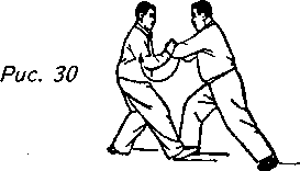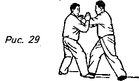 Когда ваш партнер проводит “стискивание” правой рукой перед вашей грудью (как показано на рис. 21), вы отводите его левую ладонь влево своей левой рукой, а не отталкиваете его правой ладони обеими руками. В этот момент поверните немного влево свой корпус и вместо того, чтобы отводить левой рукой в сторону его левый локоть, отведите его левое предплечье, (рис. 29).