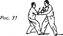 Нейтрализовав силу его “стискивания”, переведите свои руки в позицию “толчка”. Теперь ему придется перенести свою левую ладонь по выгнутой вверх дуге от левого вашего локтя к правому, а затем движением всего тела назад перейти к “откату назад” вашей правой руки. Вам необходимо тут же провести движение “толчок” (рис. 31); Таким образом вы оба успешно поменяли позиции рук.