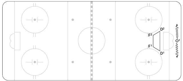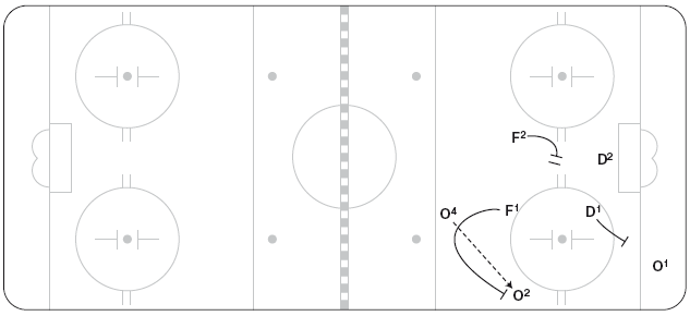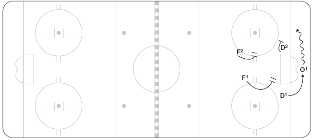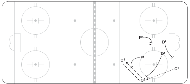 F1 оттесняет О4 в угол у синей линии (рисунок 10.19). О4 отдает пас назад О2 у длинного борта, но выше зоны прессинга D1. Тогда F1 возвращается и прессингует принявшего передачу игрока, оттесняя О2 к борту. D1 готов сделать перехват под носом у О1. D2 удерживает пятачок и не дает развития поперек площадки. Если шайба вновь у О4, возникают два варианта: (1) F1 может вернуться ко входу в зону и оказывать силовое давление там; или же (2) прессингует F2, а F1 возвращается на пятачок. F2 начинает прессинг, только если он может достигнуть точки назначения одновременно с переданной шайбой.