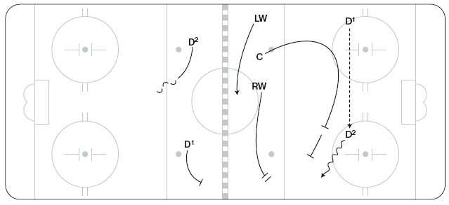F1 оказывает силовое давление или остается на прямой броска О4, пока тот с шайбой пересекает синюю линию (рисунок 10.20). D1 постепенно перемещается, готовясь последовать за О2, если игра пойдет на него. F2 отходит назад, образуя схему «ромб», в намерении перекрыть линию паса к О5, в случае необходимости. D2 действует у ворот. Сохраняйте такую расстановку, пока О4 остается в центре синей линии.