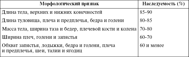 Морфологические признаки находятся в более жесткой наследственной зависимости. Вследствие этого они трудно поддаются развитию, и поэтому обладают большой прогностической значимостью при оценке спортивных способностей. В таблице 2 приведена степень наследуемости некоторых морфологических признаков у человека. Из нее следует, что наибольшее влияние генетических факторов испытывают продольные размеры тела, меньшее – широтные размеры, и еще меньшее – объемные размеры, т. е. обхват тела (44).
