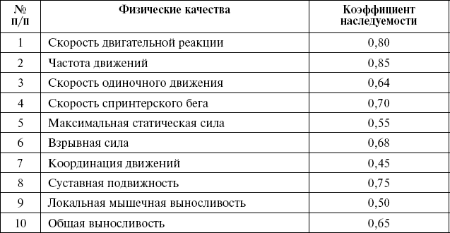 Профессор В. А. Таймазов и профессор Е. Б. Сологуб, НГУ имени П. Ф. Лесгафта, (82)определили коэффициенты наследуемости физических качеств, проявляющихся в спортивной деятельности (таблица 3).