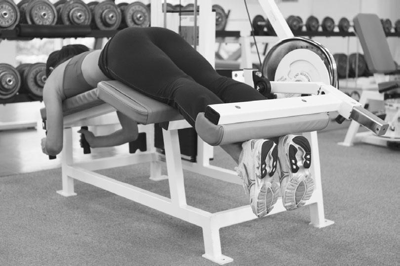 1. Лягте лицом вниз на скамью тренажера для сгибания ног. Зафиксируйте ноги, носки ног немного разведите.