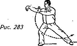 Движение 1 (продолжает рис. 282): Удерживая неподвижной правую ладонь, сложенную в клювообразную форму, перенесите центр тяжести опять на правую ногу, немного поверните верхнюю часть корпуса вправо и выверните вовнутрь левый носок. Одновременно с этим переместите левую руку назад, чтобы она оказалась перед правым предплечьем, а взгляд обратите на нее (рис. 283).