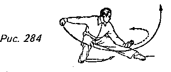 Движение 2: Медленно опустите корпус, припадая на правую ногу и выставляя левую как можно дальше влево, при этом образуется расширенный шаг (в китайской боевой терминологии он обычно называется “распростертым”). Проделав это, опустите левую руку к левому бедру и скользящим движением проведите вдоль внутренней стороны правой ноги. Взгляд следит за левой ладонью (рис. 284).