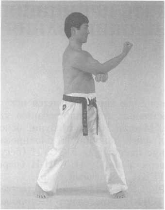 Здесь показана техника из Ката с повернутой верхней частью тела. Во время исполнения техники вы должны повернуть верхнюю часть тела, не ослабляя стойку, не поднимая плеч и не теряя осанку. На фотографии видно, что наибольшее напряжение создается в туловище. Умение создавать это экстремальное напряжение является главной целью практики НАИХАНЧИН ШОДАН.