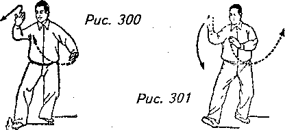 Движение (продолжает рис. 299): Сделайте полшага вперед левой ногой и перенесите на нее вес своего тела, затем поднимите правую ногу и упритесь ее пяткой в землю, а колено чуть согните, образуя правый “свободный шаг”. Выполняя эту часть упражнения, передвиньте правую руку от правого бока к лицу до уровня бровей, держа ладонь направленной влево. Левая же рука должна пройти около внутренней стороны правого предплечья с ладонью, развернутой вправо, до уровня груди. Взгляд должен быть обращен в сторону правой ладони (рис. 300, 301).