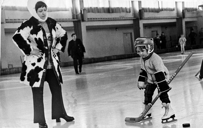 Первые шаги в хоккее юного Антона под присмотром мамы. 1972 год