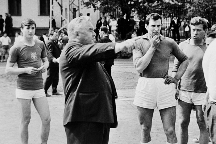 Умудренный опытом футбольный судья Борис Локтев руководит процессом на турнире среди любителей. Конец 60-х