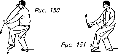 Движение 1 (продолжает рис. 149): Сделайте правой ногой небольшой шаг вперед, приставляя ее пятку к левой стопе, а затем перенесите вес своего тела на правую ногу, слегка согнув ее в колене. Левую ногу переставьте немного вперед, уперев носком в землю, переходя на левый “свободный шаг”. Вместе с этими движениями отведите правую ладонь к правому уху, а левую свободно опустите вдоль тела пальцами вниз. Левая ладонь должна оказаться напротив левого бедра. Взгляд искоса обращен вниз (рис. 150, 151).