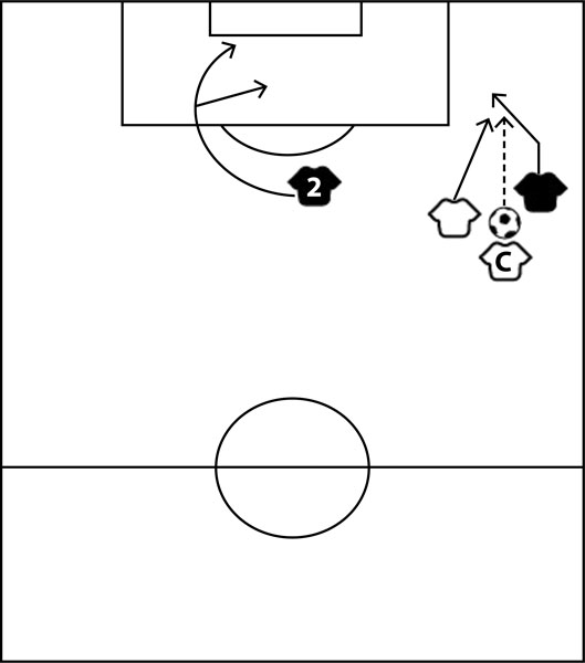 Схема 36.1. «Поворот за угол». Атакующий игрок начинает в позиции на краю поля, на один метр впереди защитника. Тренер (С) прокидывает мяч между ними. Задача игрока атаки – совершить резкое движение наперерез защитнику, выключить его из игры и выполнить передачу на атакующего игрока № 2, набегающего на дальнюю штангу или в район одиннадцатиметровой отметки.