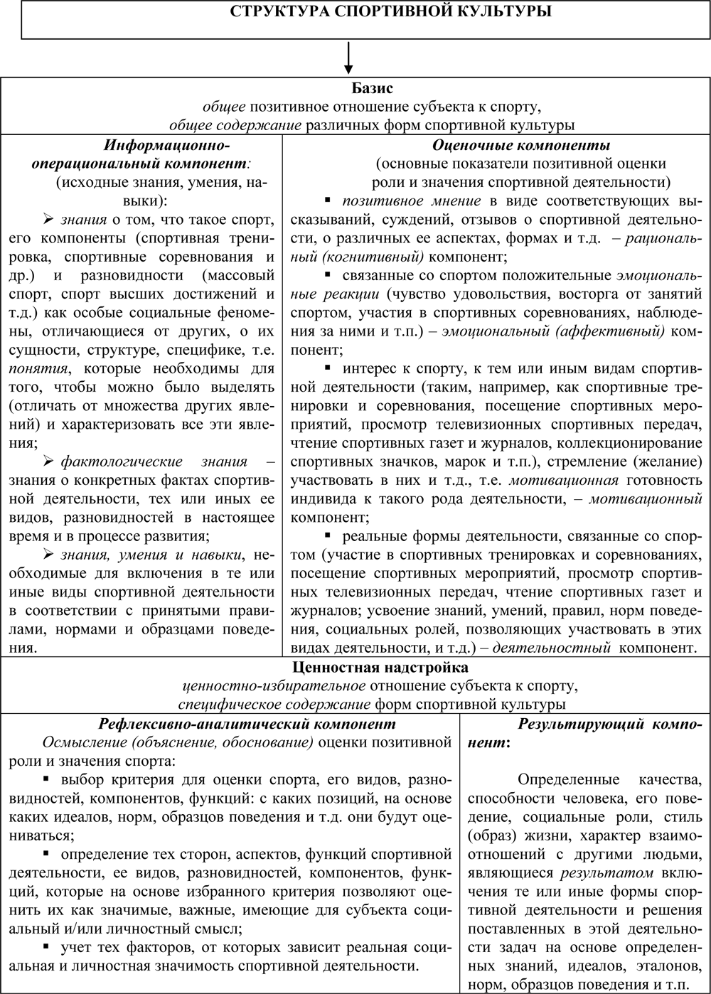 С учетом изложенного выше структуру спортивной культуры можно представить следующим образом (таблица 6).
