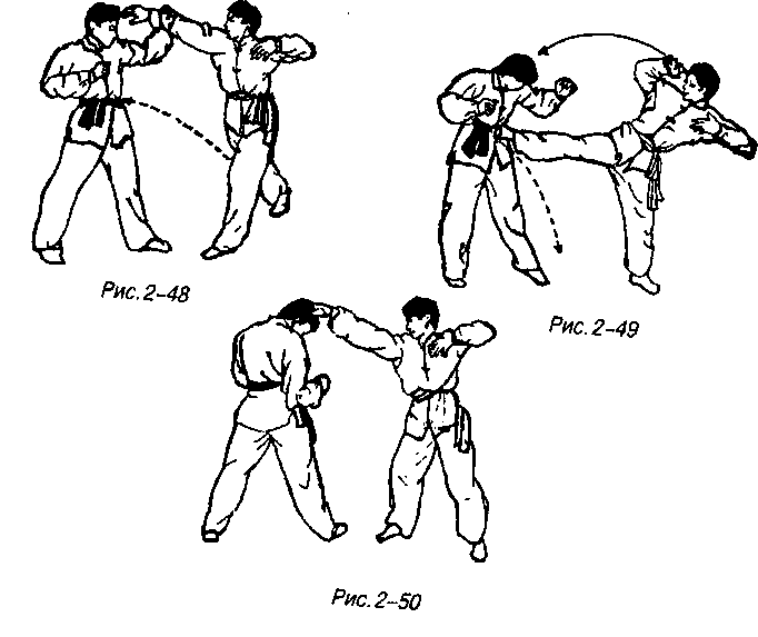 Правая нога ставится на землю, одновременно правая ладонь через верх наносит вниз с внешним ребром ладони в качестве точки приложения силы резкий рубящий удар по макушке противника (рис. 2-53).