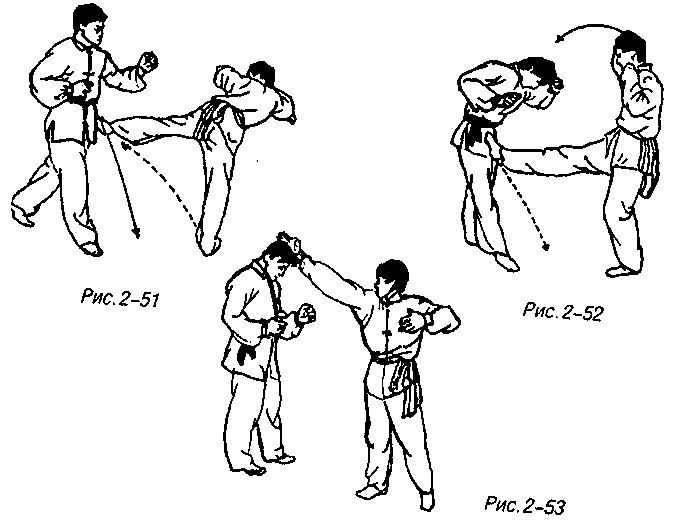 Из позиции для атаки швыряемой ладонью корпус поворачивается вправо наклоняясь при этом по диагонали вправо-вниз, одновременно правая нога принимая на себя вес тела поворачивается носком наружу, левая нога поднимается и с пяткой в качестве точки приложения силы распрямляясь в колене наносит цэчуай в живот (грудь) противника (рис. 2-51).