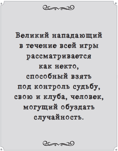 Футбол – спорт удачи и везения, в котором каждому из нас остается лишь надеяться выжать как можно больше из того небольшого воздействия, которое мы можем оказать. Но великий нападающий в течение всей игры рассматривается как некто, способный взять под контроль судьбу, свою и клуба, человек, могущий обуздать случайность. Такой игрок, как и забитые им голы, встречается редко и ценится высоко.