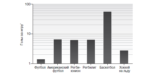 Два столбика в диаграмме 15 явно отличаются от других. Баскетбол значительно выделяется среди остальных огромным количеством пунктов. Если футбол – спорт редких событий, то баскетбол – спорт многочисленных, частых, почти беспрестанных событий. В баскетболе больше голов, чем в любом другом виде спорта, показатели различаются в десятки раз (обратите внимание, что левая шкала диаграммы экспоненциальная).