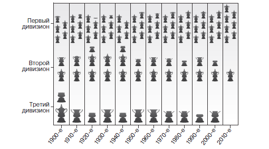 На диаграмме 16 показано количество клубов высшего дивизиона, второго дивизиона и всех более низких дивизионов, достигших четвертьфинала Кубка Англии по футболу с 1900 года. Каждый кубок представляет среднее количество, полученное одним клубом; кубки без верхней части и ручек представляют собой правильные дроби. Следовательно, в первом десятилетии двадцатого века в среднем 4,8 клуба высшего дивизиона, 1,7 клуба второго дивизиона и 1,5 клуба, не входящих в лигу, победили в соответствующей стадии и вышли в четвертьфинал.