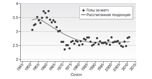 Почему же голы становятся все более и более редкими? Изменение правил оказывает лишь временный эффект – изменение правила офсайда в 1925 году, введение трех очков за победу в 1981 году и запрет для голкипера на игру рукой после паса партнера по команде в 1992 году, – если вообще оказывает. В точности так же перебои, вызванные двумя мировыми войнами, не изменили долгосрочную тенденцию.