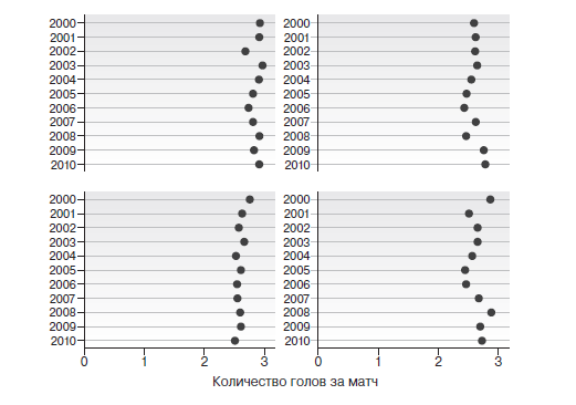 Но все же рассмотрение среднего количества забитых голов может немного дезинформировать: команда, забившая 0, 0, 0, 6 и 9 голов в пяти матчах, будет обладать тем же средним количеством голов, что и команда, забившая по три гола в каждом из пяти матчей. Усредненные данные интересны, но они не говорят нам, сколько было необычных команд или матчей и изменилось ли со временем количество этих исключений.