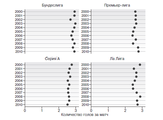 Разумно предположить, что начиная с конца Второй мировой войны подобная тенденция имела место и в разнице уровней способностей второго, третьего и четвертого дивизионов профессионального футбола. Тогда логично следующее: если только мастерство и талант (хорошо тренированные голкиперы могут быстрее двигаться и контролировать большую часть вратарской площадки, защитники быстрее реагируют на мяч и более жестко действуют в отборе мяча, полузащитники обладают большей скоростью и выносливостью, могут стремительно и без задержек возвращаться на место) являются причиной снижения количества голов, то изменения уровня соответствующих талантов во всех лигах должны означать, что количество забитых голов в их матчах также должно уменьшаться в течение двадцать первого века вплоть до настоящего момента8. Тенденции расхождения в уровне таланта должны бы идти рука об руку с тенденциями расхождения в количестве голов. Таким образом, голы должны были бы стать еще более редкими в высшем дивизионе по сравнению со следующим дивизионом, и так далее, а разница в частоте голов должна со временем увеличиваться.