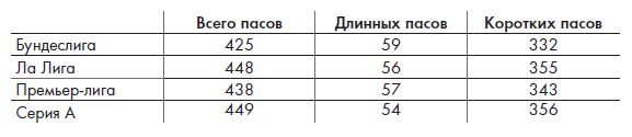 Таблица 2. Количество пасов на матч в четырех высших европейских лигах, 2010/11