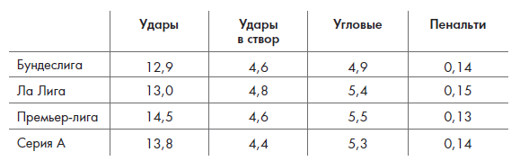Таблица 3. Удары, угловые и пенальти в четырех высших европейских лигах, 2010/11